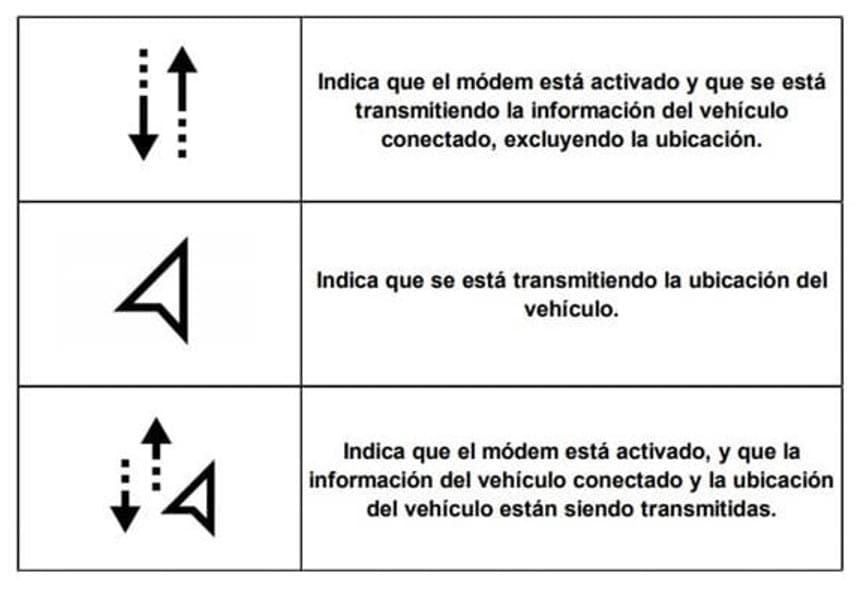 Su vehículo viene con un módem celular integrado de fábrica instalado en el vehículo. El módem, a menos que esté desactivado (desactivando la conectividad del vehículo en el menú de configuración), permite que el vehículo se conecte y se comunique con redes celulares, que pueden asociar la SIM del módem con otra información mantenida por el proveedor de la red celular, como la identificación de la torre de la red celular.
